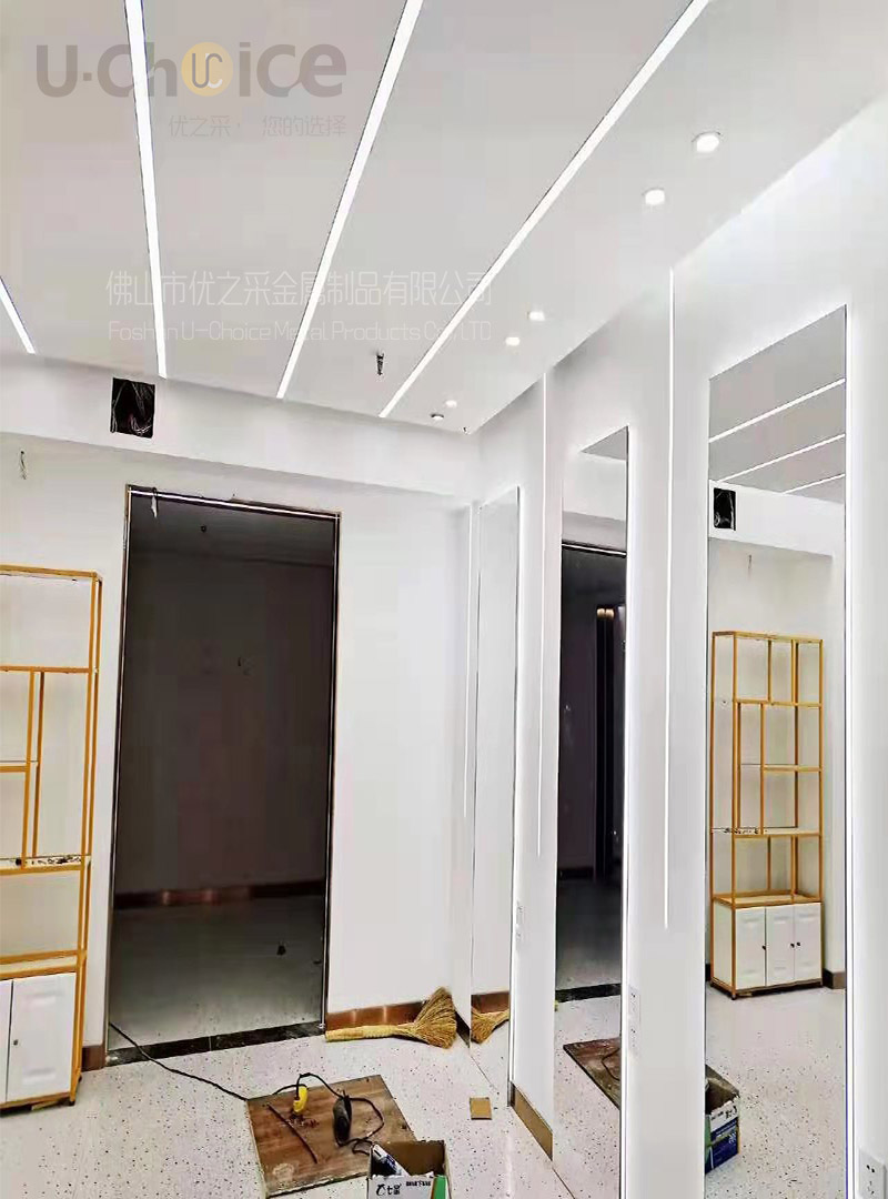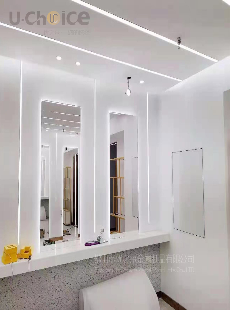 佛山優之采為了呈現空間平行的倒影效果,有鏡面反射效果搭配白色大理石瓷磚、鏡面蜂窩板?、黑鈦鏡面不銹鋼水波紋,加上燈光顏色的融入,加上蜂窩不銹鋼板作為吊頂,營造出一個流光溢彩的倒影平行空間 ,實景與倒影一實一虛極大提高了整個空間縱深感與視覺沖擊力。