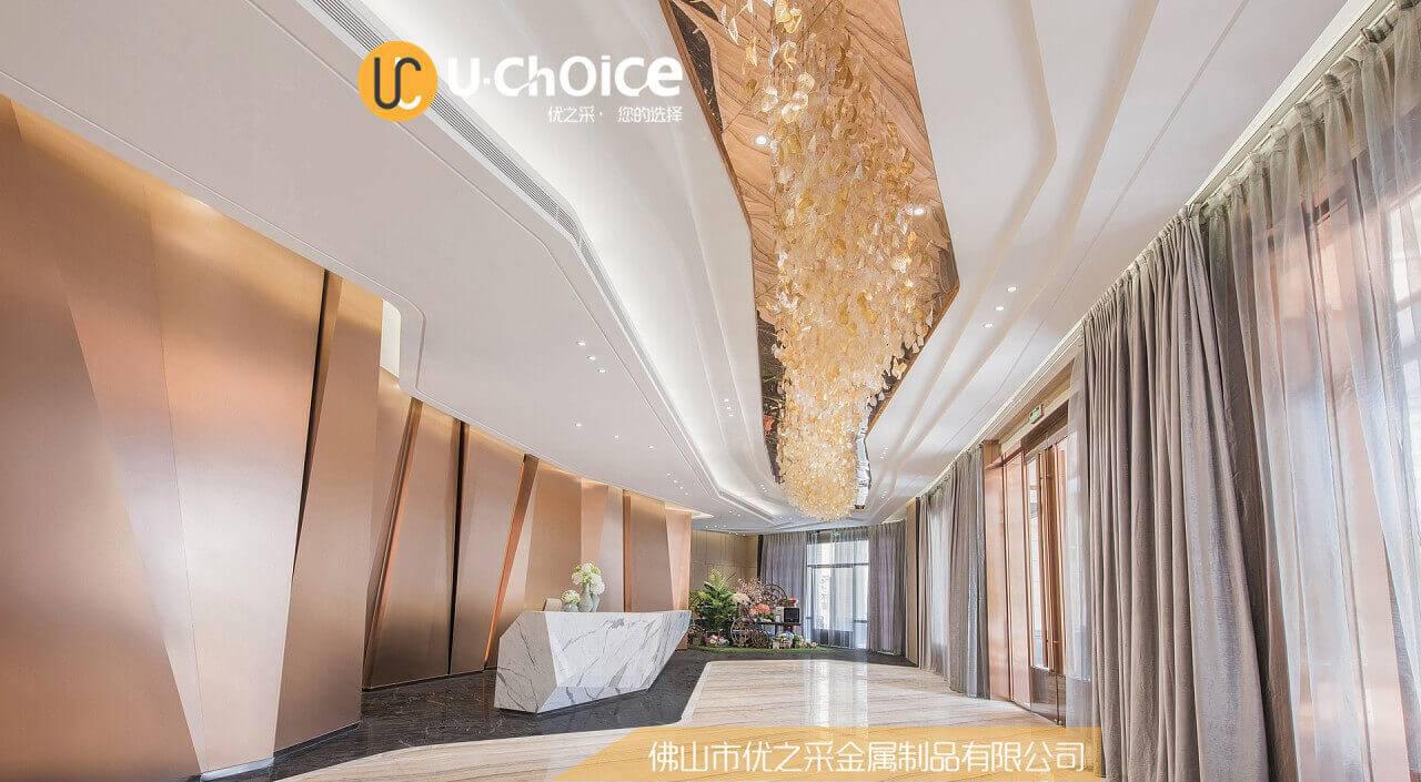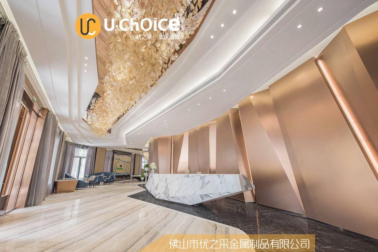 拉絲古銅幕墻憑借著自己高挑的身段,艷麗的光澤,很容易便成為了整個室內空間的一大亮點,做為整個空間的主心骨,主導著整個室內的氛圍。裝飾墻還起到一個至關重要的優點, 拉絲古銅幕墻會無形中提升整個室內的檔次和美感。