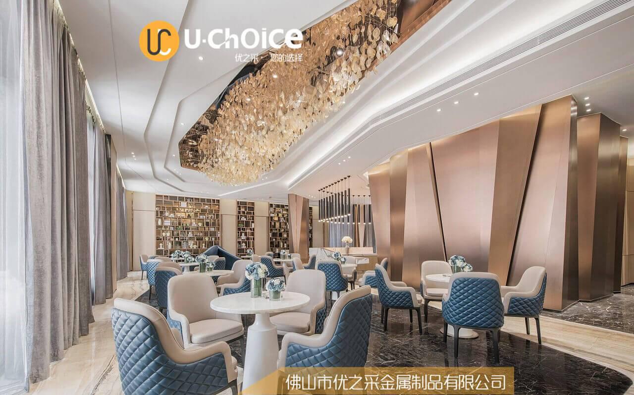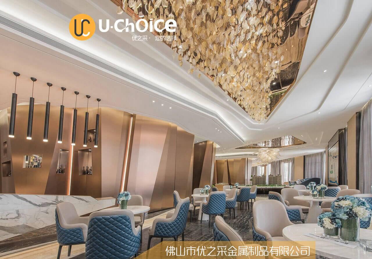 為了調和金屬的冷峻感,打破整個幕墻的調性,加上吊頂的襯托,倒是打造出另外一種儒雅高貴之氣。 拉絲古銅幕墻+精美落葉吊頂的組合,是紳士們矜持、嚴謹的外表下靜默淡然,擁有舒服的視覺沖感受。